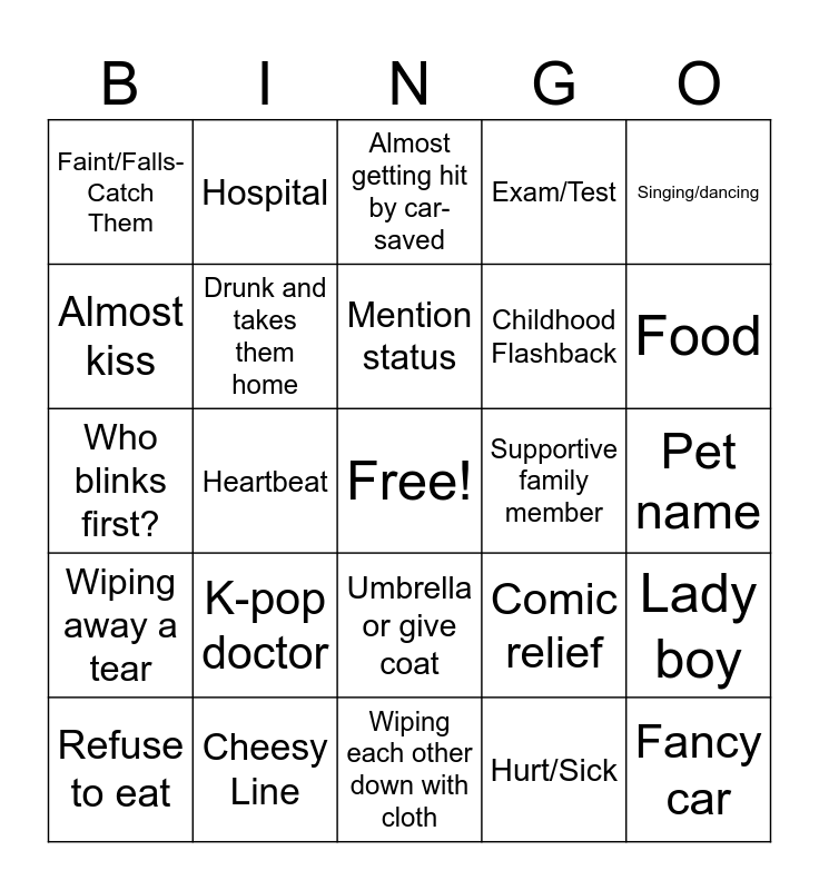This bingo card has a free space and 52 words: Cancer, Fancy car, Bath, Wiping each other down with cloth, K-pop doctor, Third wheel, Hospital, Wipe lip, Almost kiss, Miscommunication, Drunk and takes them home, Toxic family members (bonus if they are female), Lady boy, Comic relief, Applying the other’s makeup, Rich one and poor one, Mention status, Supportive family member, Brush hair over ear/out of face, Singing/dancing, Heartbeat, Hurt/Sick, Faint/Falls- Catch Them, Childhood Flashback, Parent Pushing Education, Eating food from the others mouth, Gift, Feeding Them, Food, Servant/Maid, Left Unread, Exam/Test, Tattoos or Matching Jewelry, Product Drops/Subliminal Messaging, Bitchy Girl/Regina George, Almost getting hit by car-saved, Cheesy Line, Rubbing Noses, Seal the Deal, Daydreaming, Blackmail, Pet name, Wiping away a tear, Wedding, Umbrella or give coat, Bribery, City view, Who blinks first?, Sound effects, 2nd GL Side romance, Refuse to eat and We made up.