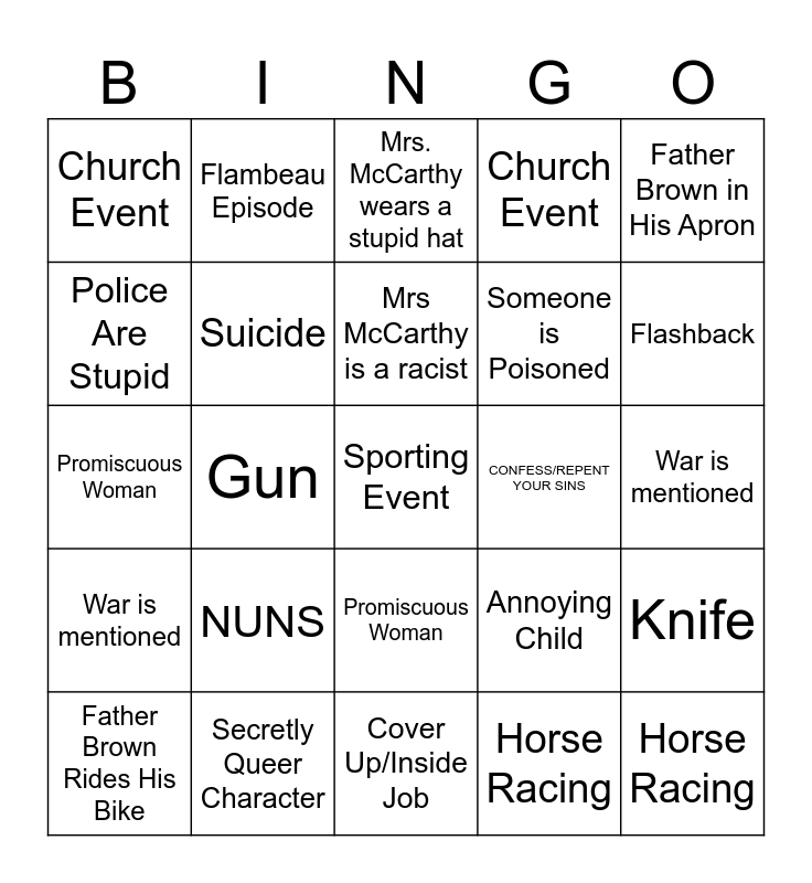 ⚠ This card has duplicate items: Sid is protective (2), Sid sleeps with a married woman (2), Mrs. McCarthy wears a stupid hat (2), Award Winning Scones (2), The Inspector gets mad at Father Brown (2), Older Man Younger Woman (2), Old Woman Younger Man (2), Family Trouble (2), Flambeau Episode (2), Mrs McCarthy is a racist (2), Wrong person arrested (2), “Suicide” (2), Suicide (2), CONFESS/REPENT YOUR SINS (2), Secretly Queer Character (2), Church Event (2), Father Brown Rides His Bike (2), Police Are Stupid (2), Booze Time (2), Bible Quote (2), Someone is Poisoned (2), Sporting Event (2), Father Brown in His Apron (2), Gun (2), Knife (2), Criminal is protected by confession (2), Mrs McCarthy is dumb (2), One of The Gang Commits a Crime (2), Mrs McCarthy is Rude to People (2), NUNS (2), Bishop Visit’s (2), Mrs McCarthy Invites Herself Somewhere (2), Promiscuous Woman (2), Horse Racing (2), Sergeant Goodfellow Gets Distracted (2), Cover Up/Inside Job (2), War is mentioned (2), Flashback (2), Wig (2), Annoying Child (2)