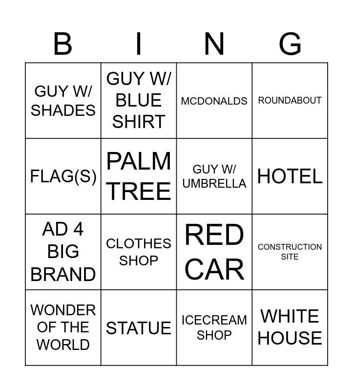 This bingo card has 16 words: STATUE, CONSTRUCTION SITE, MCDONALDS, GUY W/ SHADES, AD 4 BIG BRAND, GUY W/ BLUE SHIRT, RED CAR, ICECREAM SHOP, FLAG(S), PALM TREE, WONDER OF THE WORLD, ROUNDABOUT, CLOTHES SHOP, HOTEL, GUY W/ UMBRELLA and WHITE HOUSE.