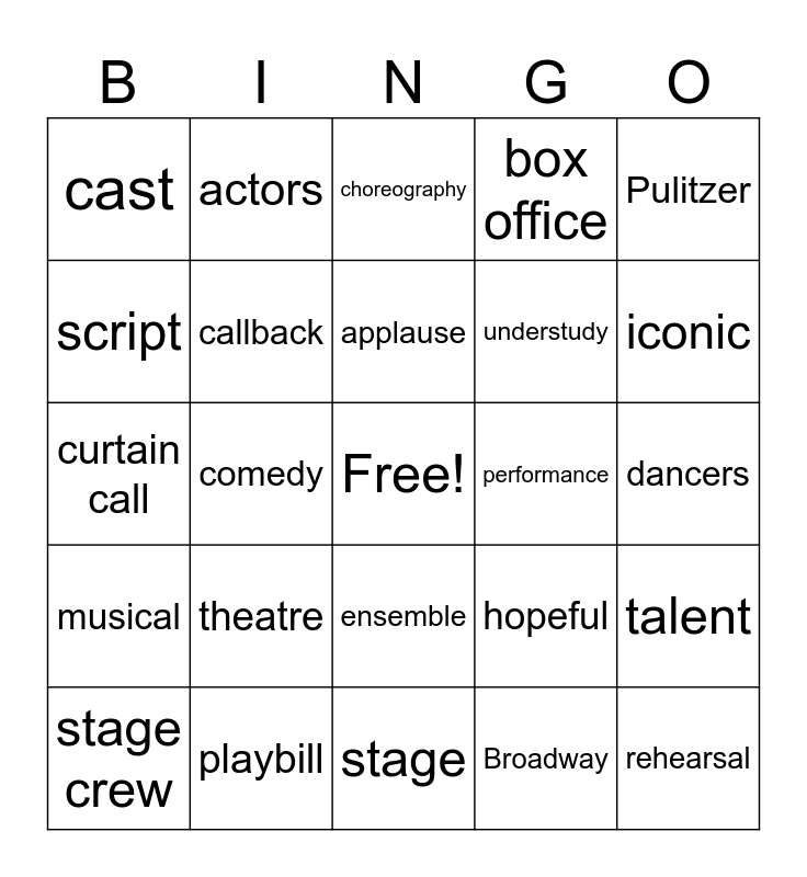 This bingo card has a free space and 31 words: stage, curtain, comedy, tragedy, cast, choreography, callback, hopeful, performance, Broadway, dancers, rehearsal, orchestra, blockbuster, iconic, spotlight, talent, theatre, musical, ensemble, Pulitzer, Tony, stage crew, actors, understudy, script, box office, curtain call, playbill, applause and standing ovation.