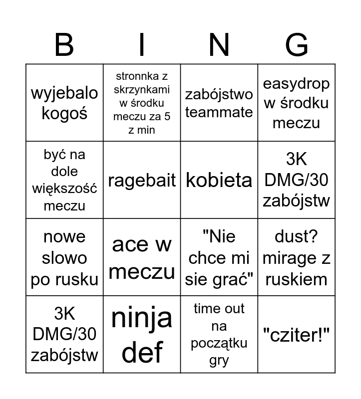 This bingo card has 19 words: "Nie chce mi sie grać", kill z zeusa/nuż, zabójstwo teammate, "cziter!", dust?mirage z ruskiem, być na dole większość meczu, time out na początku gry, wyjebalo kogoś, stronnka z skrzynkami w środku meczu za 5 z min, nowe slowo po rusku, ace w meczu, ragebait, kobieta, ninja def, 3K DMG/30 zabójstw, frag z flasha/smoka/decoy, easydrop w środku meczu, 3K DMG/30 zabójstw and ninja def.