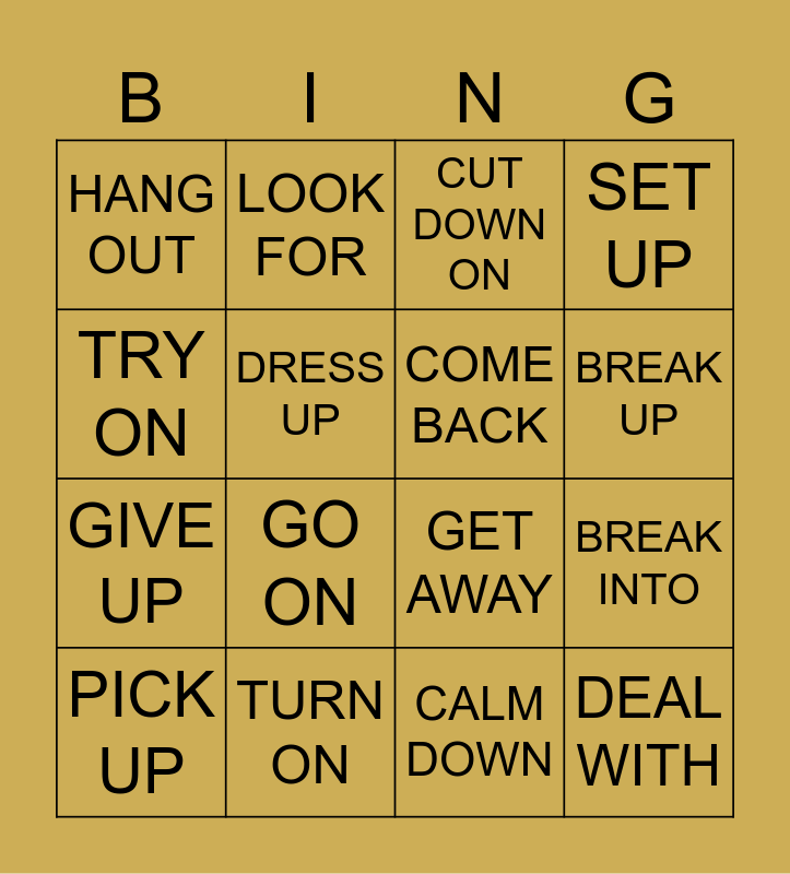 This bingo card has 20 words: PICK UP, TAKE OUT, CUT DOWN ON, BREAK INTO, FIND OUT, GO ON, CALM DOWN, SET UP, GIVE UP, LOOK FOR, GET AWAY, BREAK UP, HANG OUT, TURN ON, COME BACK, TAKE OFF, TRY ON, DRESS UP, BRING UP and DEAL WITH.