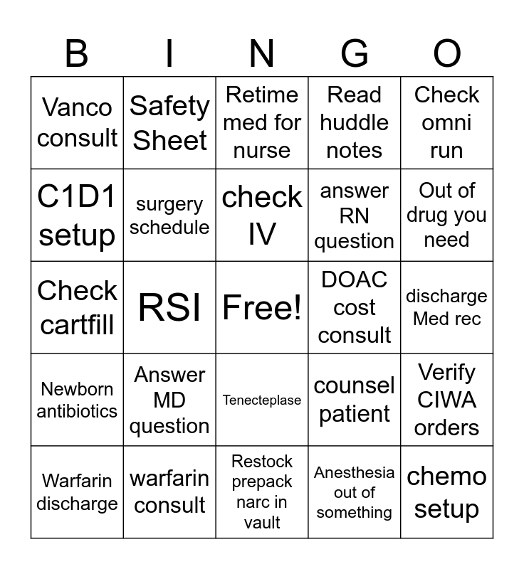 This bingo card has a free space and 29 words: Warfarin discharge, Code Blue, RSI, Rapid Response, Vanco consult, Retime med for nurse, surgery schedule, Answer MD question, DOAC cost consult, warfarin consult, discharge Med rec, chemo setup, Restock prepack narc in vault, Anesthesia out of something, Out of drug you need, STEMI heparin, Tenecteplase, Newborn antibiotics, Check omni run, Check cartfill, counsel patient, Vocera page MD, answer RN question, C1D1 setup, Read huddle notes, Safety Sheet, Verify CIWA orders, check IV and Verify patient own med.