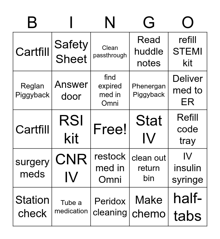 This bingo card has a free space and 29 words: Station check, find expired med in Omni, RSI kit, Thaw frozens, Cartfill, Clean passthrough, Answer door, CNR IV, Stat IV, Tube a medication, Refill code tray, half-tabs, Peridox cleaning, Make chemo, Deliver med to ER, Tape insulin label, restock med in Omni, surgery meds, refill STEMI kit, Cartfill, clean out return bin, Fix omni count, Phenergan Piggyback, Reglan Piggyback, Read huddle notes, Safety Sheet, IV insulin syringe, find expired med in Omni and Balfaxar.