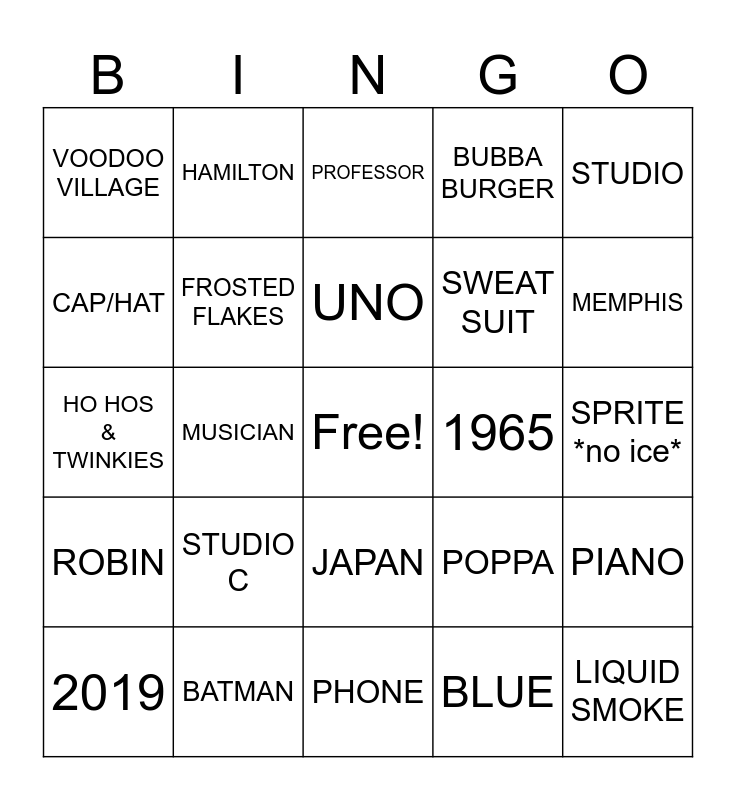This bingo card has a free space and 32 words: BLUE, 60, MUSICIAN, GRIZZLIES, ROBIN, FROSTED FLAKES, STUDIO, PIANO, HAMILTON, FOOTBALL & BASKETBALL, UNO, PROFESSOR, *write any artist KC has worked with*, CON FUNK SHUN, 1965, TNT, 2019, HO HOS & TWINKIES, JAPAN, STUDIO C, POPPA, LIBRA, SPRITE *no ice*, BATMAN, LIQUID SMOKE, BUBBA BURGER, SWEAT SUIT, CAP/HAT, VOODOO VILLAGE, PHONE, AIRPLANE and MEMPHIS.