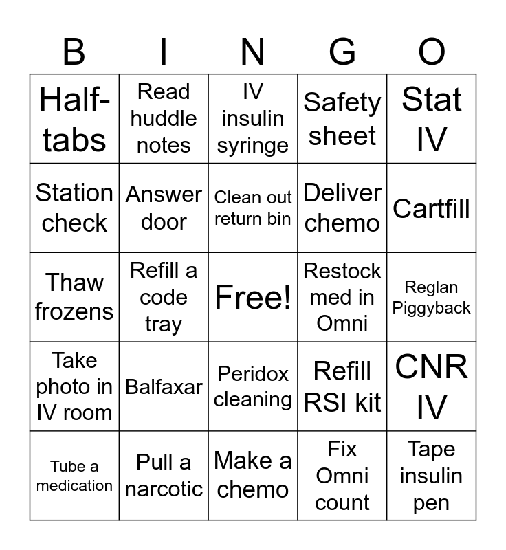 This bingo card has a free space and 29 words: Tube a medication, Find an expired medication in Omni, Refill a code tray, Prepack something, Half-tabs, IV insulin syringe, Answer door, Balfaxar, Restock med in Omni, Pull a narcotic, Reglan Piggyback, Tape insulin pen, Make a chemo, Fix Omni count, Cartfill, Answer door, Peridox cleaning, Take photo in IV room, Stat IV, Thaw frozens, Refill RSI kit, Deliver med to ER, Deliver chemo, Station check, Safety sheet, Read huddle notes, CNR IV, Clean out return bin and Phenergan piggyback.
