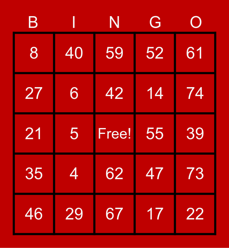 This bingo card has a free space and 24 words: 4, 29, 42, 46, 61, 8, 27, 40, 55, 62, 14, 21, 47, 73, 6, 17, 39, 59, 74, 5, 22, 35, 52 and 67.