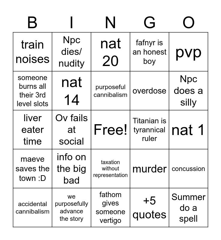 This bingo card has a free space and 24 words: info on the big bad, we purposefully advance the story, purposeful cannibalism, accidental cannibalism, pvp, train noises, someone burns all their 3rd level slots, Npc dies/ nudity, Titanian is tyrannical ruler, taxation without representation, overdose, liver eater time, murder, concussion, nat 14, +5 quotes, nat 1, nat 20, Npc does a silly, Ov fails at social, Summer do a spell, maeve saves the town :D, fafnyr is an honest boy and fathom gives someone vertigo.