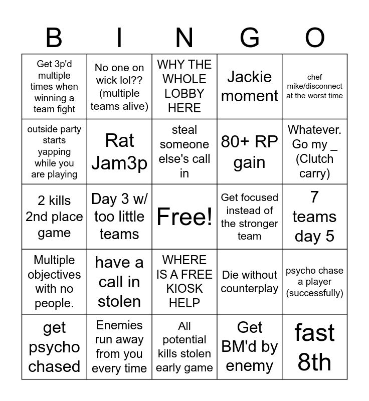 This bingo card has a free space and 24 words: get psycho chased, have a call in stolen, steal someone else's call in, Get BM'd by enemy, chef mike/disconnect at the worst time, Get 3p'd multiple times when winning a team fight, No one on wick lol?? (multiple teams alive), WHY THE WHOLE LOBBY HERE, Get focused instead of the stronger team, 7 teams day 5, 2 kills 2nd place game, Rat Jam3p, Die without counterplay, psycho chase a player (successfully), outside party starts yapping while you are playing, Enemies run away from you every time, All potential kills stolen early game, Jackie moment, Whatever. Go my _ (Clutch carry), Multiple objectives with no people., Day 3 w/ too little teams, WHERE IS A FREE KIOSK HELP, 80+ RP gain and fast 8th.