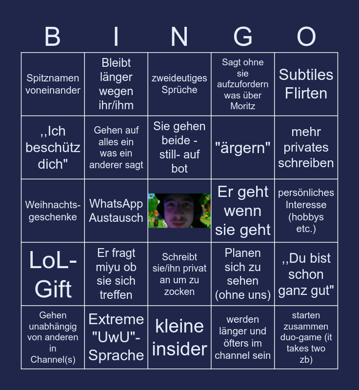 This bingo card has a free space and 24 words: Er fragt miyu ob sie sich treffen, Extreme "UwU"-Sprache, Sie gehen beide -still- auf bot, Gehen unabhängig von anderen in Channel(s), Subtiles Flirten, Spitznamen voneinander, ,,Ich beschütz dich", Bleibt länger wegen ihr/ihm, Er geht wenn sie geht, Schreibt sie/ihn privat an um zu zocken, "ärgern", Weihnachts-geschenke, Planen sich zu sehen (ohne uns), ,,Du bist schon ganz gut", Gehen auf alles ein was ein anderer sagt, werden länger und öfters im channel sein, persönliches Interesse (hobbys etc.), zweideutiges Sprüche, mehr privates schreiben, WhatsApp Austausch, starten zusammen duo-game (it takes two zb), LoL-Gift, Sagt ohne sie aufzufordern was über Moritz and kleine insider.