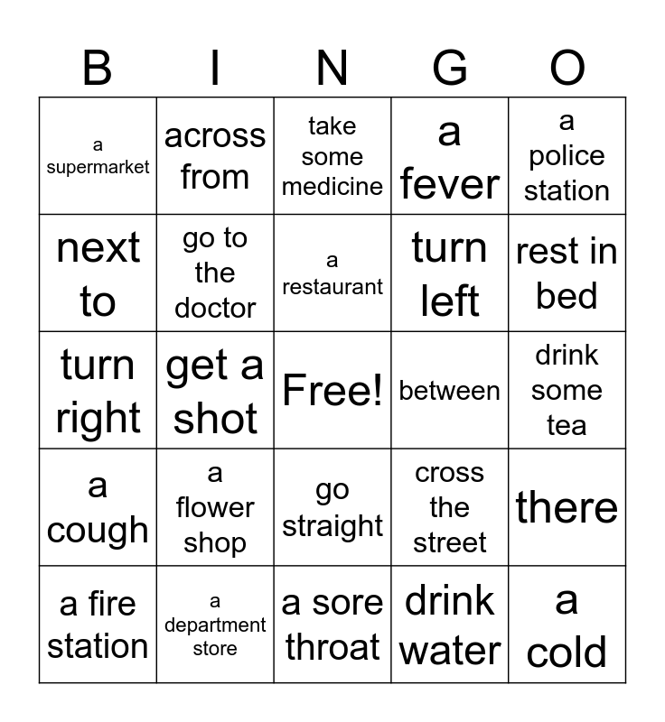 This bingo card has a free space and 24 words: a flower shop, a department store, a restaurant, a fire station, a police station, a supermarket, next to, across from, between, go straight, turn left, turn right, cross the street, there, go to the doctor, drink water, drink some tea, take some medicine, rest in bed, get a shot, a cold, a cough, a fever and a sore throat.