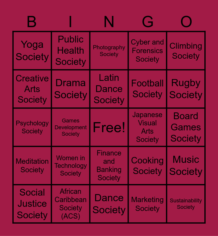 This bingo card has a free space and 30 words: African Caribbean Society (ACS), Rounders Society, Games Development Society, Creative Writing Society, Yoga Society, Photography Society, Drama Society, Finance and Banking Society, Japanese Visual Arts Society, Dance Society, Board Games Society, Sustainability Society, Marketing Society, Law and Advocacy Society, Rugby Society, Martial Arts Society, Cooking Society, Meditation Society, Women in Technology Society, Climbing Society, Psychology Society, Charity Society, Public Health Society, Football Society, Creative Arts Society, Cyber and Forensics Society, Music Society, Social Justice Society, Latin Dance Society and Film Society.