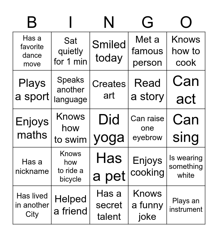 This bingo card has a free space and 24 words: Knows how to ride a bicycle, Helped a friend, Creates art, Has lived in another City, Knows how to cook, Has a favorite dance move, Plays a sport, Sat quietly for 1 min, Can raise one eyebrow, Has a pet, Read a story, Enjoys maths, Enjoys cooking, Is wearing something white, Speaks another language, Knows a funny joke, Can sing, Smiled today, Can act, Knows how to swim, Plays an instrument, Has a nickname, Met a famous person and Has a secret talent.
