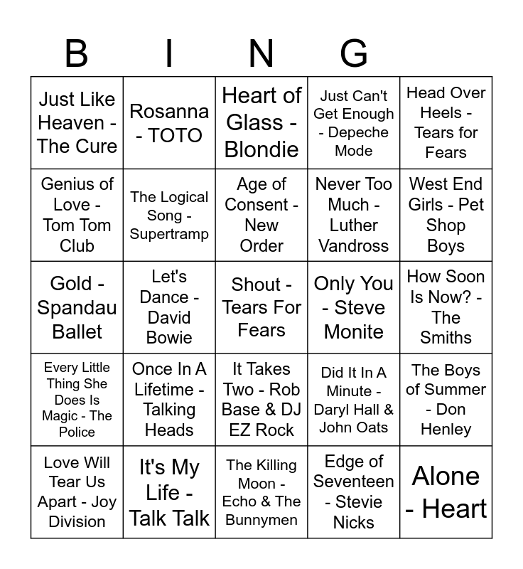 This bingo card has 25 words: Once In A Lifetime - Talking Heads, The Killing Moon - Echo & The Bunnymen, Age of Consent - New Order, Love Will Tear Us Apart - Joy Division, Head Over Heels - Tears for Fears, Just Like Heaven - The Cure, Genius of Love - Tom Tom Club, Rosanna - TOTO, Only You - Steve Monite, It Takes Two - Rob Base & DJ EZ Rock, Never Too Much - Luther Vandross, Gold - Spandau Ballet, Did It In A Minute - Daryl Hall & John Oats, The Boys of Summer - Don Henley, The Logical Song - Supertramp, Alone - Heart, How Soon Is Now? - The Smiths, Heart of Glass - Blondie, West End Girls - Pet Shop Boys, Let's Dance - David Bowie, Shout - Tears For Fears, It's My Life - Talk Talk, Every Little Thing She Does Is Magic - The Police, Just Can't Get Enough - Depeche Mode and Edge of Seventeen - Stevie Nicks.