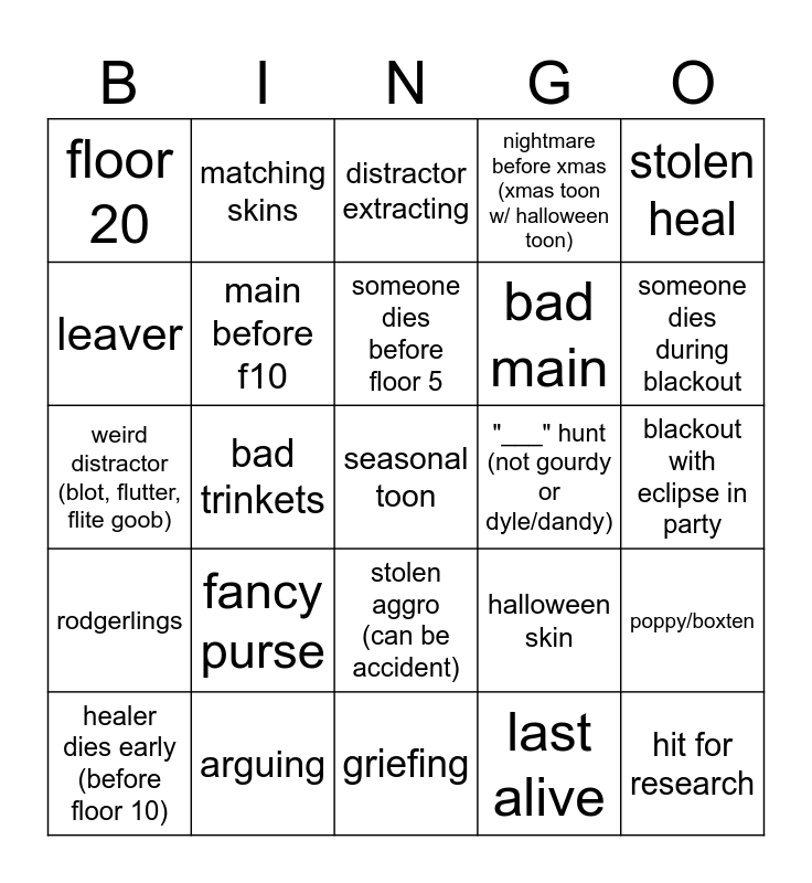 This bingo card has a free space and 29 words: healer dies early (before floor 10), dyle/dandy, bad trinkets, gourdy, floor 20, distractor extracting, main before f10, fancy purse, "___" hunt (not gourdy or dyle/dandy), arguing, blackout with eclipse in party, hit for research, griefing, last alive, someone dies during blackout, sans and papyrus (2 ribeccas), stolen aggro (can be accident), rodgerlings, stolen heal, weird distractor (blot, flutter, flite goob), halloween skin, floor 30, bad main, leaver, nightmare before xmas (xmas toon w/ halloween toon), matching skins, poppy/boxten, someone dies before floor 5 and "ability on cooldown".