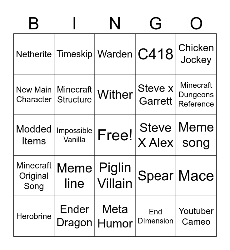 This bingo card has a free space and 24 words: Meme line, Ender Dragon, Wither, Herobrine, Chicken Jockey, Netherite, New Main Character, Timeskip, Steve X Alex, Piglin Villain, Steve x Garrett, Modded Items, Spear, Mace, Minecraft Structure, End DImension, Meme song, Warden, Minecraft Dungeons Reference, Impossible Vanilla, Youtuber Cameo, Minecraft Original Song, C418 and Meta Humor.