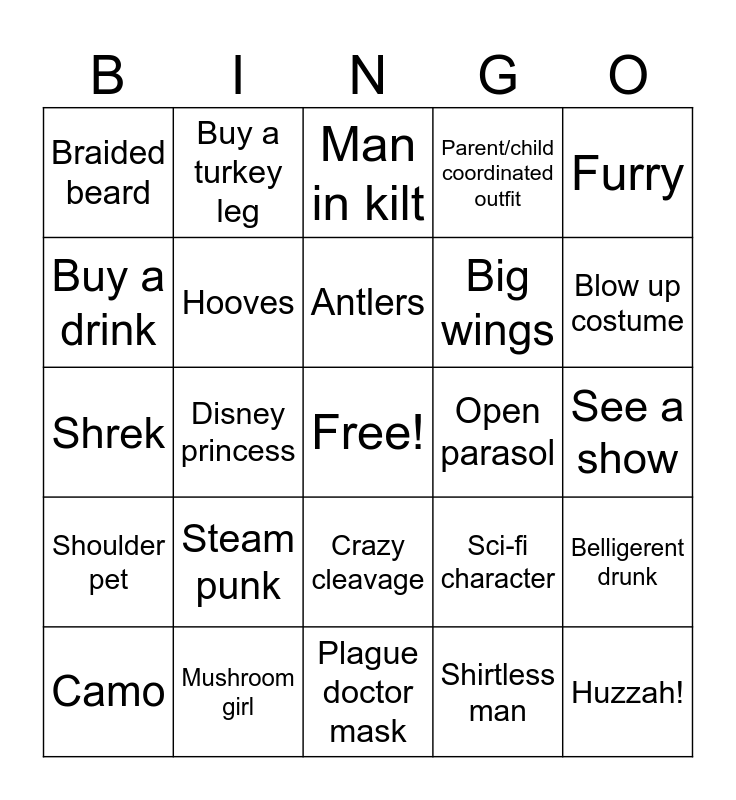 This bingo card has a free space and 26 words: Crazy cleavage, Shirtless man, Antlers, Mushroom girl, Furry, Braided beard, Buy a drink, Buy a turkey leg, See a show, Sci-fi character, Big wings, Shrek, Belligerent drunk, Camo, Disney princess, Person on stilts, Parent/child coordinated outfit, Shoulder pet, Man in kilt, Huzzah!, Blow up costume, Plague doctor mask, Open parasol, Steam punk, Hooves and Ye Olde.