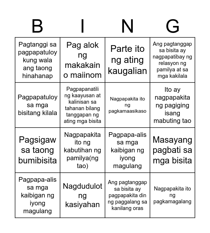 This bingo card has 21 words: Nagdudulot ng kasiyahan, Mahinahon at magalang na pagtanggi sa inaalok na binebentang pagkain o serbisyo, Pag alok ng makakain o maiinom, Maayos na pagtatanong ng pangalan ng bisita, Ang pagtanggap sa bisita ay pagpapakita din ng paggalang sa kanilang oras, Nagpapakita ito ng pagkamaasikaso, Pagtanggi sa pagpapatuloy kung wala ang taong hinahanap, Parte ito ng ating kaugalian, Pagpapa-alis sa mga kaibigan ng iyong magulang, Ito ay nagpapakita ng pagiging isang mabuting tao, Pagsigaw sa taong bumibisita, Ang pagtanggap sa bisita ay nagpapatibay ng relasyon ng pamilya at sa mga kakilala, Nagpapakita ito ng pagkamagalang, Magalang na pagbanggit na wala ang taong hinahanap sa bahay, Pagpapanatili ng kaayusan at kalinisan sa tahanan bilang tanggapan ng ating mga bisita, Pakikipag-agawan ng pagkain sa bisita, Pagpapa-alis sa mga kaibigan ng iyong magulang, Nagpapakita ito ng kabutihan ng pamilya(ng tao), Pagpapatuloy sa mga bisitang kilala, Masayang pagbati sa mga bisita and Pakikipag kwentuhan kahit hindi ka kasama sa usapan.