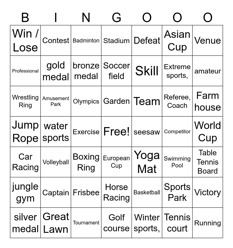 This bingo card has a free space and 49 words: Sports Park, Extreme sports,, Winter sports,, water sports, Olympics, World Cup, Contest, Tournament, Asian Cup, European Cup, Venue, Stadium, Referee, Coach, Team, Captain, Competitor, Professional, amateur, Victory, Defeat, Skill, Exercise, Win / Lose, gold medal, silver medal, bronze medal, Farm house, Great Lawn, Garden, Amusement Park, Swing, slide, seesaw, jungle gym, Frisbee, Jump Rope, Yoga Mat, Swimming Pool, Table Tennis Board, Wrestling Ring, Boxing Ring, Horse Racing, Car Racing, Running, Golf course, Soccer field, Badminton, Basketball, Volleyball and Tennis court.