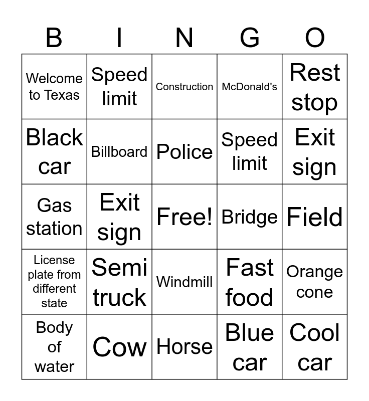 This bingo card has a free space and 28 words: Orange cone, Red car, Speed limit, Blue car, Black car, Construction, Speed limit, License plate from different state, Bridge, Body of water, Gas station, McDonald's, Cow, Horse, Exit sign, White car, Semi truck, Billboard, Police, Windmill, Welcome to Texas, Truck, Cool car, Exit sign, Field, Fast food, Rest stop and Orange cone.