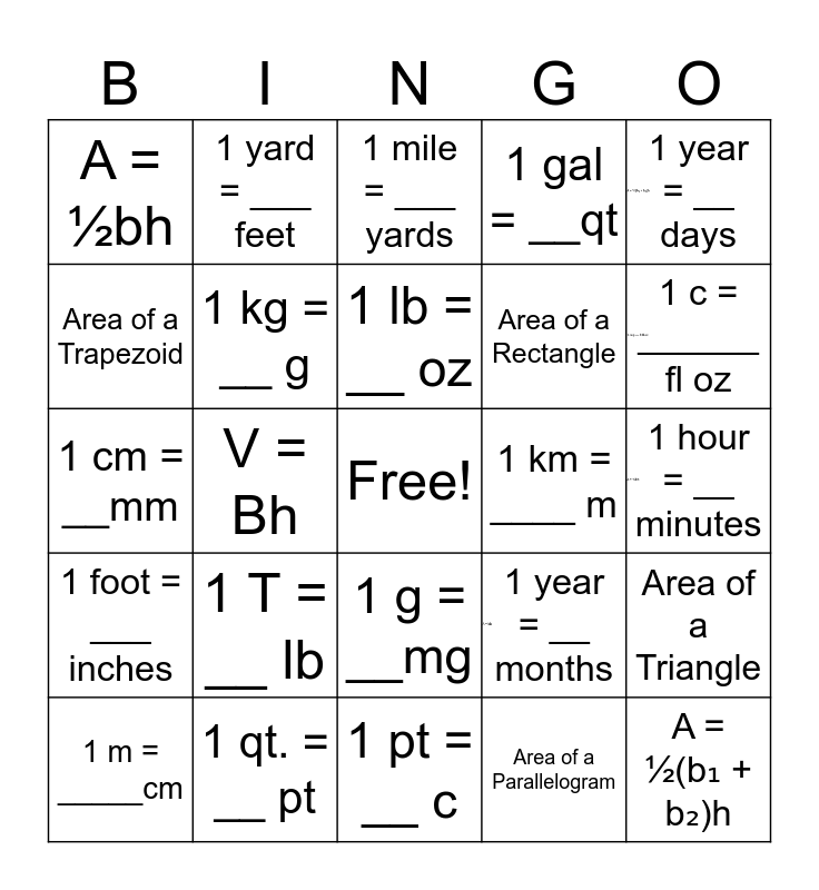 This bingo card has 5 images, a free space and 27 words: Area of a Triangle, Volume of a Rectangular Prism, Area of a Rectangle, Area of a Parallelogram, Area of a Trapezoid, 1 mile = ___ yards, 1 yard = ___ feet, 1 foot = ___ inches, 1 km = ____ m, 1 m = _____cm, 1 cm = __mm, 1 gal = __qt, 1 qt. = __ pt, 1 pt = __ c, 1 c = ______ fl oz, 1 L = __mL, 1 T = __ lb, 1 kg = __ g, 1 lb = __ oz, 1 g = __mg, A = ½bh, A = bh, A = ½(b₁ + b₂)h, V = Bh, 1 hour = __ minutes, 1 year = __ months and 1 year = __ days.