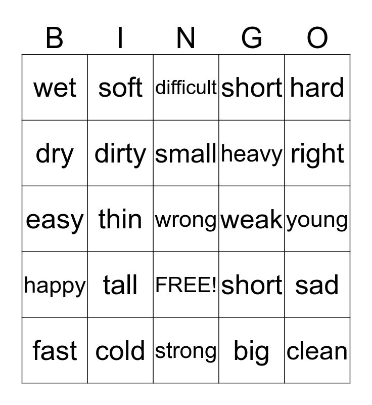 This bingo card has 26 words: FREE!, big, small, cold, hard, wet, dry, soft, young, short, heavy, easy, sad, fast, thin, fat, short, happy, difficult, wrong, right, strong, weak, tall, dirty and clean.
