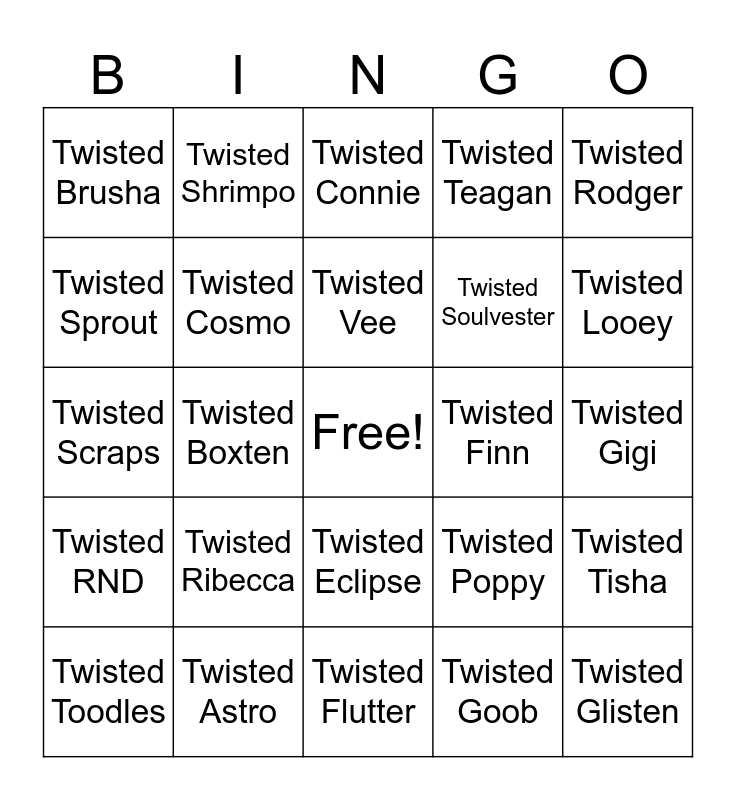 This bingo card has a free space and 30 words: Twisted Astro, Twisted Blot, Twisted Boxten, Twisted Brightney, Twisted Brusha, Twisted Connie, Twisted Cosmo, Twisted Eclipse, Twisted Finn, Twisted Flutter, Twisted Gigi, Twisted Glisten, Twisted Goob, Twisted Gourdy, Twisted Looey, Twisted Pebble, Twisted Poppy, Twisted RND, Twisted Ribecca, Twisted Rodger, Twisted Scraps, Twisted Shelly, Twisted Shrimpo, Twisted Soulvester, Twisted Sprout, Twisted Teagan, Twisted Tisha, Twisted Toodles, Twisted Vee and Twisted Yatta.