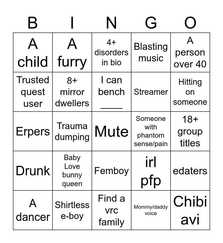 This bingo card has a free space and 24 words: Baby Love bunny queen, Shirtless e-boy, I can bench ____, A dancer, A person over 40, A child, Trusted quest user, A furry, Someone with phantom sense/pain, Femboy, Streamer, Erpers, irl pfp, edaters, 8+ mirror dwellers, Mommy/daddy voice, 18+ group titles, 4+ disorders in bio, Hitting on someone, Trauma dumping, Chibi avi, Drunk, Blasting music and Find a vrc family.
