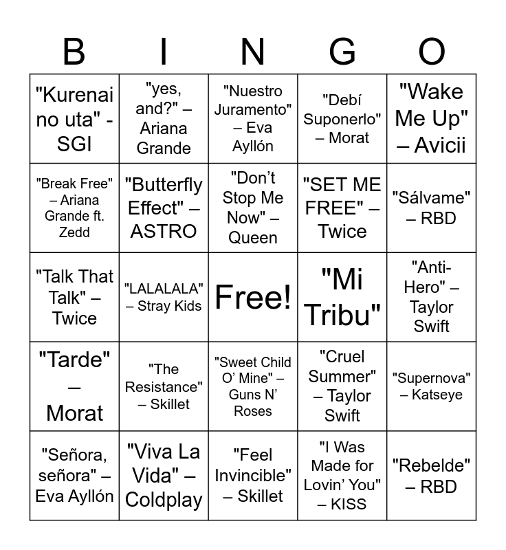 This bingo card has a free space and 26 words: "Sweet Child O’ Mine" – Guns N’ Roses, "I Was Made for Lovin’ You" – KISS, "Don’t Stop Me Now" – Queen, "Viva La Vida" – Coldplay, "Wake Me Up" – Avicii, "Kurenai no uta" - SGI, "Break Free" – Ariana Grande ft. Zedd, "yes, and?" – Ariana Grande, "Anti-Hero" – Taylor Swift, "Cruel Summer" – Taylor Swift, "SET ME FREE" – Twice, "Talk That Talk" – Twice, "Supernova" – Katseye, "Señora, señora" – Eva Ayllón, "LALALALA" – Stray Kids, "Heaven" – Stray Kids, "Debí Suponerlo" – Morat, "Tarde" – Morat, "Nuestro Juramento" – Eva Ayllón, "Rebelde" – RBD, "Sálvame" – RBD, "Feel Invincible" – Skillet, "Mi Tribu", "The Resistance" – Skillet, "Butterfly Effect" – ASTRO and "Not Alone" – Sunjae.