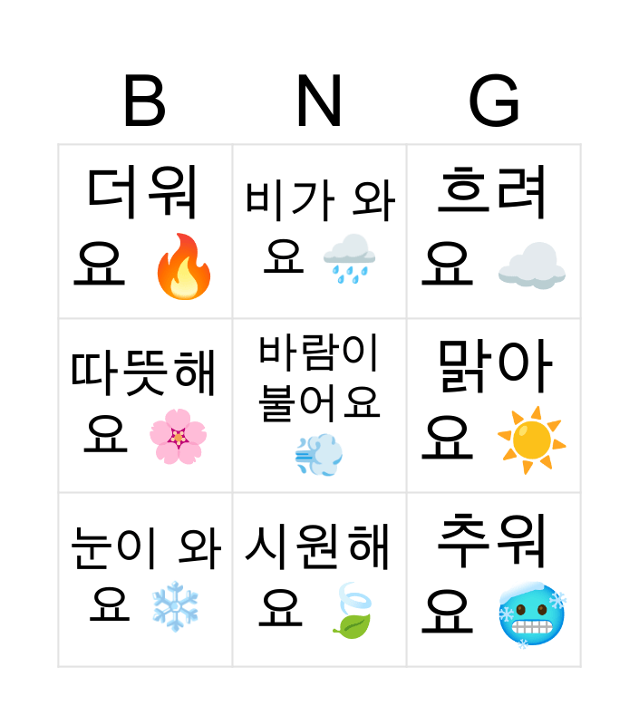 This bingo card has a free space and 8 words: 맑아요 ☀️, 흐려요 ☁️, 비가 와요 🌧️, 눈이 와요 ❄️, 더워요 🔥, 추워요 🥶, 따뜻해요 🌸 and 시원해요 🍃.