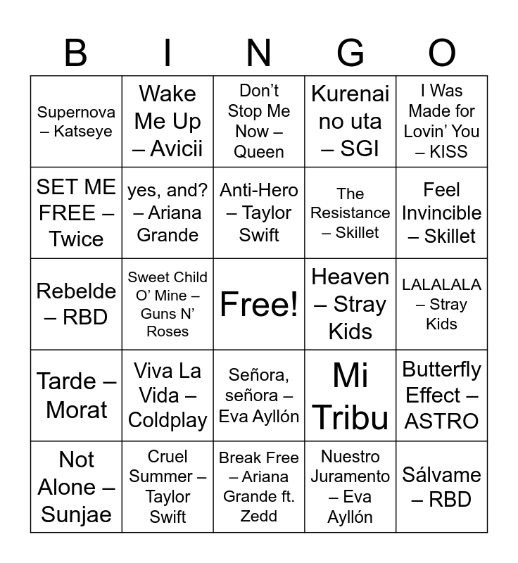 This bingo card has a free space and 25 words: Viva La Vida – Coldplay, Break Free – Ariana Grande ft. Zedd, Anti-Hero – Taylor Swift, Not Alone – Sunjae, I Was Made for Lovin’ You – KISS, Supernova – Katseye, SET ME FREE – Twice, Wake Me Up – Avicii, Heaven – Stray Kids, Señora, señora – Eva Ayllón, The Resistance – Skillet, Rebelde – RBD, Mi Tribu, Butterfly Effect – ASTRO, yes, and? – Ariana Grande, Debí Suponerlo – Morat, LALALALA – Stray Kids, Don’t Stop Me Now – Queen, Feel Invincible – Skillet, Sweet Child O’ Mine – Guns N’ Roses, Sálvame – RBD, Cruel Summer – Taylor Swift, Tarde – Morat, Kurenai no uta – SGI and Nuestro Juramento – Eva Ayllón.