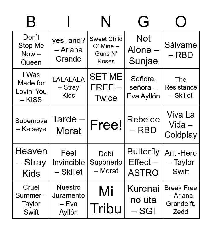 This bingo card has a free space and 25 words: Feel Invincible – Skillet, Mi Tribu, SET ME FREE – Twice, Cruel Summer – Taylor Swift, Sálvame – RBD, Don’t Stop Me Now – Queen, I Was Made for Lovin’ You – KISS, yes, and? – Ariana Grande, Rebelde – RBD, Debí Suponerlo – Morat, Señora, señora – Eva Ayllón, Supernova – Katseye, Butterfly Effect – ASTRO, Anti-Hero – Taylor Swift, LALALALA – Stray Kids, Wake Me Up – Avicii, Viva La Vida – Coldplay, Sweet Child O’ Mine – Guns N’ Roses, The Resistance – Skillet, Tarde – Morat, Break Free – Ariana Grande ft. Zedd, Nuestro Juramento – Eva Ayllón, Heaven – Stray Kids, Not Alone – Sunjae and Kurenai no uta – SGI.
