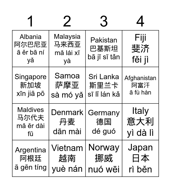 This bingo card has 32 words: China 中国 zhōng guó, Australia 澳大利亚 ào dà lì yǎ, Italy 意大利 yì dà lì, Iran 伊朗 yī lǎng, Japan 日本 rì běn, Sri Lanka 斯里兰卡 sī lǐ lán kǎ, Singapore 新加坡 xīn jiā pō, New Zealand 纽西兰 niǔ xī lán, Malaysia 马来西亚 mǎ lái xī yà, England 英国 yīng guó, Afghanistan 阿富汗 ā fù hàn, Pakistan 巴基斯坦 bā jī sī tǎn, Africa 非洲 fēi zhōu, India 印度 yìn dù, Vietnam 越南 yuè nán, Egypt 埃及 āi jí, France 法国 fà guó, Germany 德国 dé guó, South Korea 南韩 nán hán, Canada 加拿大 jiā ná dà, Thailand 泰国 tài guó, Portugal 葡萄牙 pú táo yá, Norway 挪威 nuó wēi, America 美国 měi guó, Argentina 阿根廷 ā gēn tíng, Fiji 斐济 fěi jì, Maldives 马尔代夫 mǎ ěr dài fū, Samoa 萨摩亚 sà mó yǎ, Albania 阿尔巴尼亚 ā ěr bā ní yǎ, Mongolia 蒙古 méng gǔ, Finland 芬兰 fēn lán and Denmark 丹麦 dān mài.