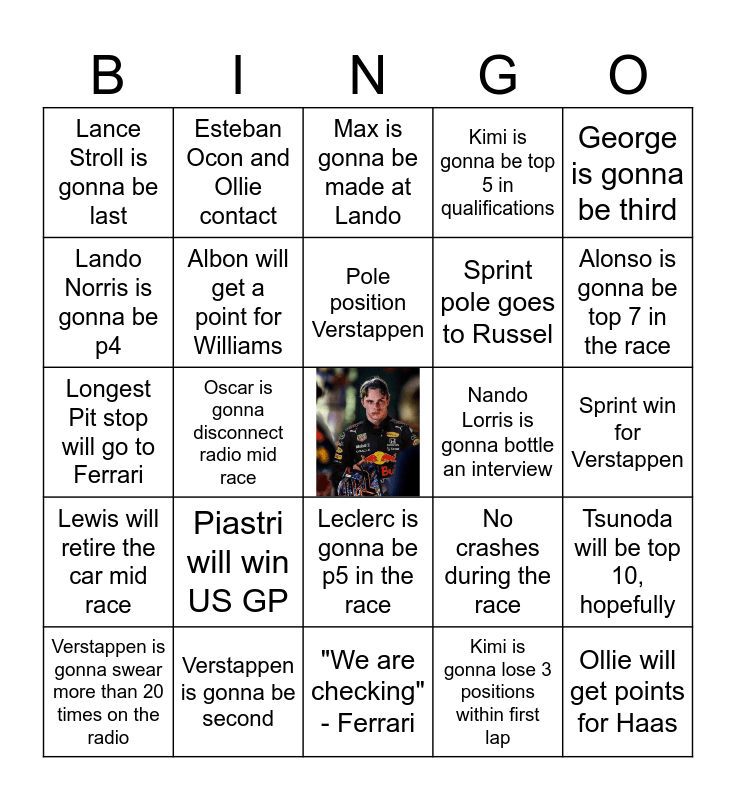 This bingo card has a free space and 24 words: Piastri will win US GP, Verstappen is gonna be second, Pole position Verstappen, Verstappen is gonna swear more than 20 times on the radio, George is gonna be third, Lance Stroll is gonna be last, Lando Norris is gonna be p4, Esteban Ocon and Ollie contact, Nando Lorris is gonna bottle an interview, Leclerc is gonna be p5 in the race, Sprint pole goes to Russel, Longest Pit stop will go to Ferrari, No crashes during the race, Tsunoda will be top 10, hopefully, Albon will get a point for Williams, Kimi is gonna lose 3 positions within first lap, Sprint win for Verstappen, Max is gonna be made at Lando, Alonso is gonna be top 7 in the race, Oscar is gonna disconnect radio mid race, Ollie will get points for Haas, Lewis will retire the car mid race, Kimi is gonna be top 5 in qualifications and "We are checking" - Ferrari.