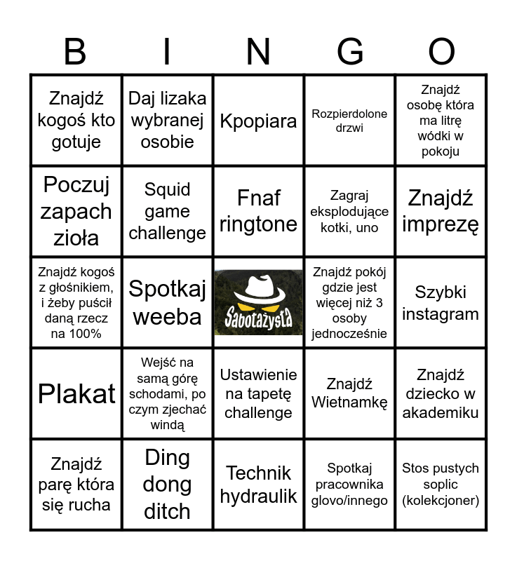This bingo card has a free space and 24 words: Wejść na samą górę schodami, po czym zjechać windą, Ding dong ditch, Fnaf ringtone, Znajdź parę która się rucha, Znajdź osobę która ma litrę wódki w pokoju, Znajdź kogoś kto gotuje, Poczuj zapach zioła, Daj lizaka wybranej osobie, Znajdź pokój gdzie jest więcej niż 3 osoby jednocześnie, Ustawienie na tapetę challenge, Zagraj eksplodujące kotki, uno, Znajdź kogoś z głośnikiem, i żeby puścił daną rzecz na 100%, Znajdź Wietnamkę, Znajdź dziecko w akademiku, Squid game challenge, Spotkaj pracownika glovo/innego, Szybki instagram, Kpopiara, Znajdź imprezę, Spotkaj weeba, Stos pustych soplic (kolekcjoner), Plakat, Rozpierdolone drzwi and Technik hydraulik.