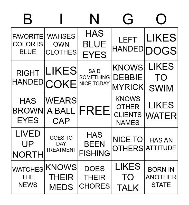 This bingo card has a free space and 24 words: GOES TO DAY TREATMENT, KNOWS THEIR MEDS, SAID SOMETHING NICE TODAY, WATCHES THE NEWS, LIKES DOGS, FAVORITE COLOR IS BLUE, RIGHT HANDED, WAHSES OWN CLOTHES, KNOWS OTHER CLIENTS NAMES, HAS BEEN FISHING, KNOWS DEBBIE MYRICK, HAS BROWN EYES, NICE TO OTHERS, HAS AN ATTITUDE, LIKES COKE, LIKES TO TALK, LIKES WATER, HAS BLUE EYES, LIKES TO SWIM, WEARS A BALL CAP, BORN IN ANOTHER STATE, LIVED UP NORTH, LEFT HANDED and DOES THEIR CHORES.