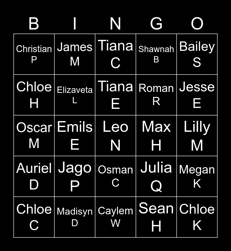 This bingo card has 117 words: Free!, Cassidy A, Alexis A, Amber A, Kayla B, Adela B, Shawnah B, Huxley B, Will B, Matt B, Judd B, Benjamin B, Ava B, Nicholas C, Paige C, Matt C, Osman C, Leo C, Egor C, Quinn C, Chloe C, Tiana C, Sienna C, Dylan C, Max C, Auriel D, Madisyn D, Hayden D, Mia E, Sophie E, Jesse E, Tiana E, Emils E, Jessica E, Chloe F, Adam F, William F, Samantha F, Angelina F, Sebe G, Tyler G, Owen G, Tabitha G, Marley G, Hamish G, Lachlan H, Sean H, Chloe H, Finn H, Aiden H, Emily H, Max H, Zarko J, Matthew J, Oam J, Noah K, Chloe K, Jaime K, Reece K, Zachary K, Megan K, Aurora K, Zachary L, Danny L, Jay L, David L, Leo L, Elizaveta L, Oscar M, Danny M, Lilly M, Tahlayla M, Angelina M, Yasmin M, Isabella M, James M, Leo N, Jago P, Christian P, Olivia P, Matias P, Beatrix P, Harry P, Leo Q, Julia Q, Joshua Read, Roman R, Joshua Roberts, Matt S, Daniel S, Elliot S, Oliver S, Amy-Lee S, Phineas S, Scarlett S, Bailey S, Isabella S, Rachel S, Satdhana S, Karl T, Diesel T, Kyla T, Julia T, Tiana T, Luca T, Nata T, Nevaeh T, Shane V, Nathan W, Randall W, Caylem W, Mia Y, Harry Z, James Z, Maggie Z, Gigi Z and Reina Z.