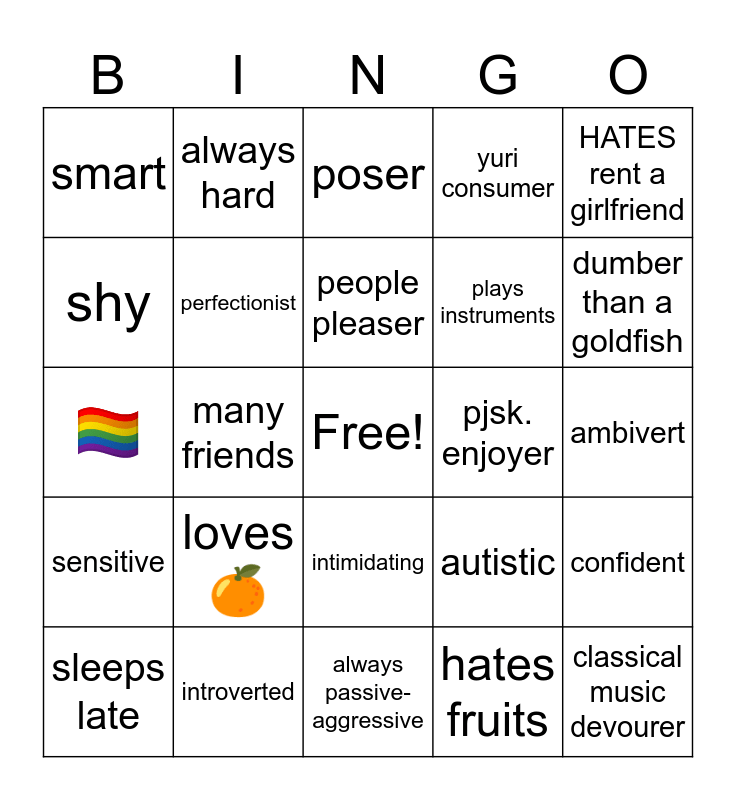 This bingo card has a free space and 24 words: loves 🍊, introverted, people pleaser, sleeps late, HATES rent a girlfriend, smart, shy, always hard, pjsk. enjoyer, intimidating, plays instruments, 🏳️🌈, autistic, confident, perfectionist, hates fruits, ambivert, poser, dumber than a goldfish, many friends, classical music devourer, sensitive, yuri consumer and always passive-aggressive.