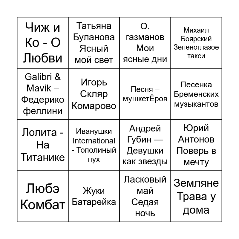 This bingo card has 37 words: Браво – Любите девушки, Ирина Аллегрова – угонщица, Михаил Круг – ВладимирскиЙ централ, Песня – мушкетЁров, Г. Лепс – Рюмка водки на столе, Любэ – атас, Песенка Бременских музыкантов, Татьяна Куртукова – Матушка земля, Galibri & Mavik – Федерико феллини, ЮриЙ шатунов – Белые розы, Юрий Антонов Поверь в мечту, Михаил Боярский Зеленоглазое такси, Любэ Комбат, Ласковый май Седая ночь, Игорь Скляр Комарово, Земляне Трава у дома, Игорь Корнелюк Город которого нет, О. газманов Мои ясные дни, Группа На-На - Фаина, Жуки Батарейка, Чиж и Ко - О Любви, Иванушки International - Тополиный пух, Руки Вверх - 18 мне уже, Надежда Кадышева и Ансамбль Золотое Кольцо - Плывет веночек, КиШ Лесник, Комбинация - Бухгалтер, Татьяна Буланова Ясный мой свет, Anna asti – царица, Нэнси Дым сигарет с ментолом, Камбинация American boy, Валерий Леонтьев Дельтаплан, Александр Серов Как быть, Андрей Губин — Девушки как звезды, Максим - Знаешь ли ты, Отпетые Мошенники - Люби Меня Люби, Лолита - На Титанике and Руки Вверх - Девчонки.
