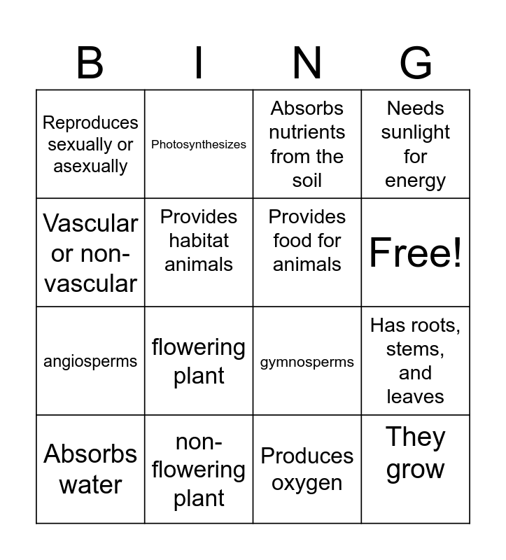 This bingo card has 17 words: Produces oxygen, Absorbs water, Absorbs nutrients from the soil, Reproduces sexually or asexually, flowering plant, Needs sunlight for energy, Has roots, stems, and leaves, Provides food for animals, Free!, Provides habitat animals, non-flowering plant, gymnosperms, Vascular or non-vascular, Photosynthesizes, angiosperms, Store energy as starch and They grow.