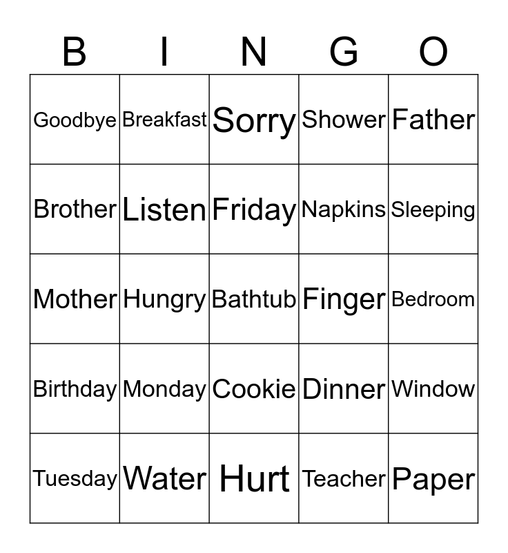 This bingo card has 30 words: Water, Please, Hungry, Bathroom, Goodbye, Sorry, Listen, Cookie, Finger, Hurt, Bedroom, Bathtub, Teacher, Paper, Sleeping, Towel, Dinner, Birthday, Monday, Father, Mother, Sunday, Breakfast, Napkins, Brother, Shower, Window, Tuesday, Friday and Color.