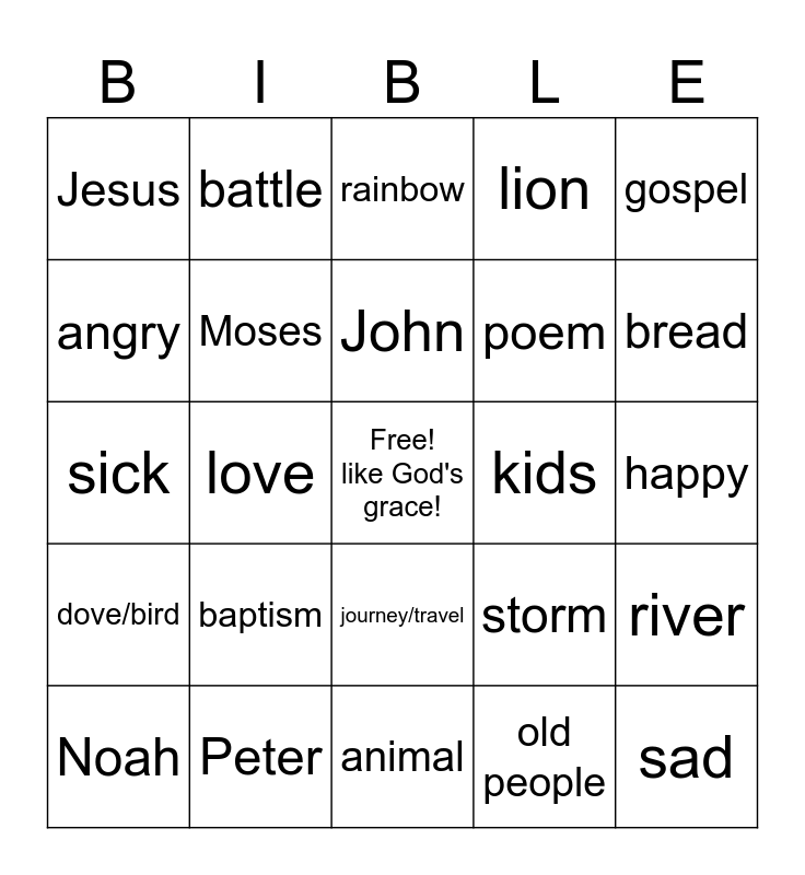 This bingo card has a free space and 31 words: animal, baby, love, God, Jesus, rainbow, Moses, storm, kids, old people, happy, sad, boat, desert, bread, cross, river, baptism, dove/bird, journey/travel, gospel, Mary, Noah, battle, poem, angry, lion, sick, Peter, John and Abraham.