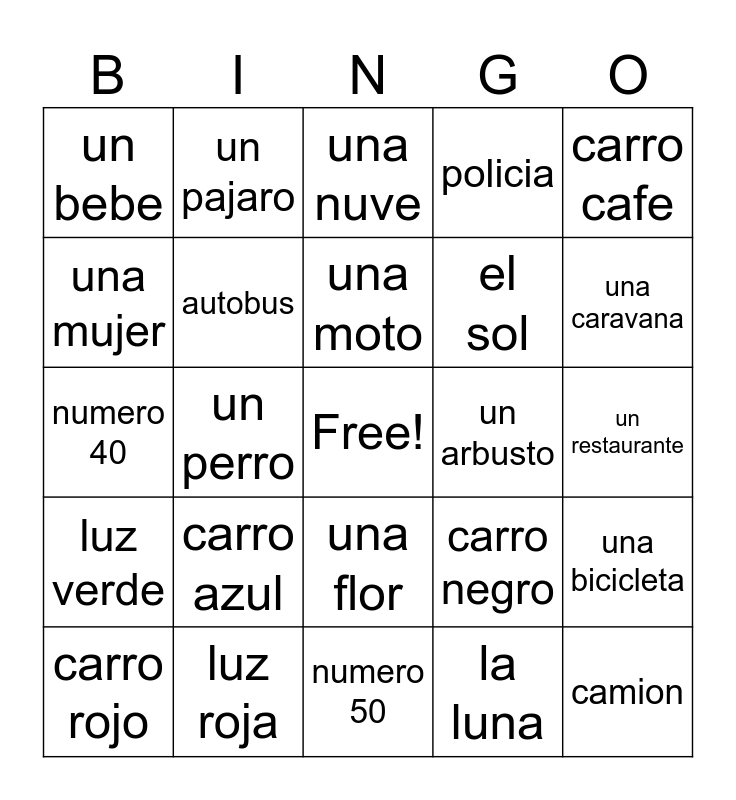 This bingo card has a free space and 29 words: carro rojo, numero 25, un perro, un arbol, un bebe, una nuve, autobus, carro azul, un arbusto, luz roja, un restaurante, camion, numero 50, la luna, una caravana, STOP, una flor, luz verde, carro cafe, numero 40, carro negro, gasolinera, el sol, una mujer, policia, un pajaro, una bicicleta, una moto and autopista.