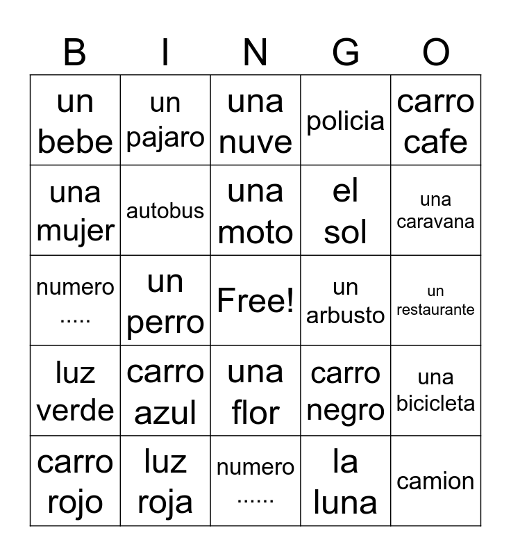 This bingo card has a free space and 29 words: carro rojo, numero ......, un perro, un arbol, un bebe, una nuve, autobus, carro azul, un arbusto, luz roja, un restaurante, camion, numero ......, la luna, una caravana, STOP, una flor, luz verde, carro cafe, numero ....., carro negro, gasolinera, el sol, una mujer, policia, un pajaro, una bicicleta, una moto and autopista.