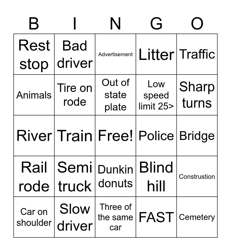 This bingo card has a free space and 24 words: Car on shoulder, Semi truck, Out of state plate, FAST, Traffic, Rest stop, Bad driver, Advertisement, Police, Bridge, River, Tire on rode, Blind hill, Construstion, Animals, Slow driver, Three of the same car, Litter, Sharp turns, Rail rode, Train, Dunkin donuts, Low speed limit 25> and Cemetery.