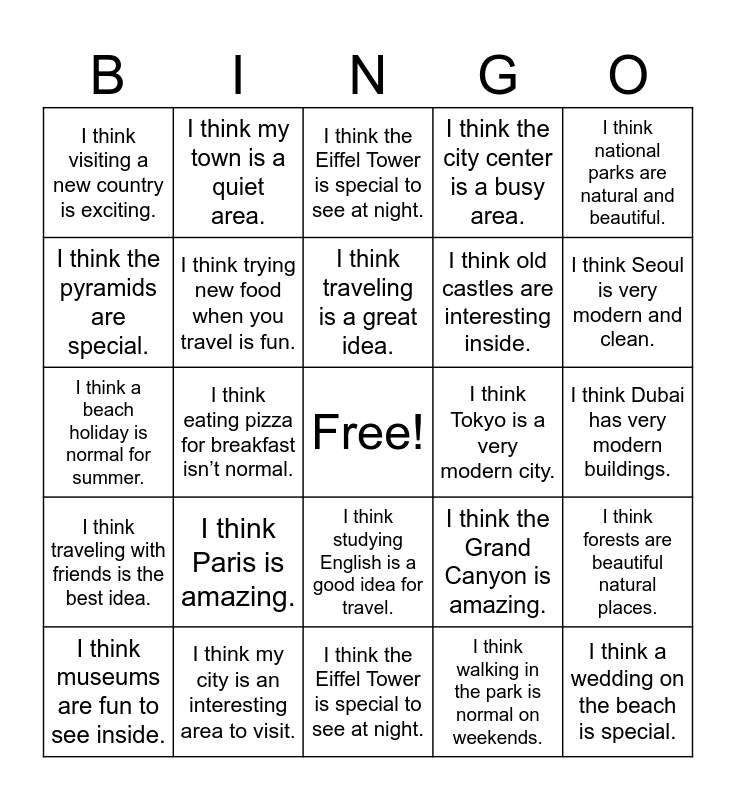 This bingo card has a free space and 24 words: I think Paris is amazing., I think my city is an interesting area to visit., I think traveling is a great idea., I think museums are fun to see inside., I think national parks are natural and beautiful., I think visiting a new country is exciting., I think the pyramids are special., I think my town is a quiet area., I think Tokyo is a very modern city., I think studying English is a good idea for travel., I think old castles are interesting inside., I think a beach holiday is normal for summer., I think the Grand Canyon is amazing., I think forests are beautiful natural places., I think trying new food when you travel is fun., I think walking in the park is normal on weekends., I think Dubai has very modern buildings., I think the Eiffel Tower is special to see at night., I think Seoul is very modern and clean., I think eating pizza for breakfast isn’t normal., I think a wedding on the beach is special., I think traveling with friends is the best idea., I think the city center is a busy area. and I think the Eiffel Tower is special to see at night..