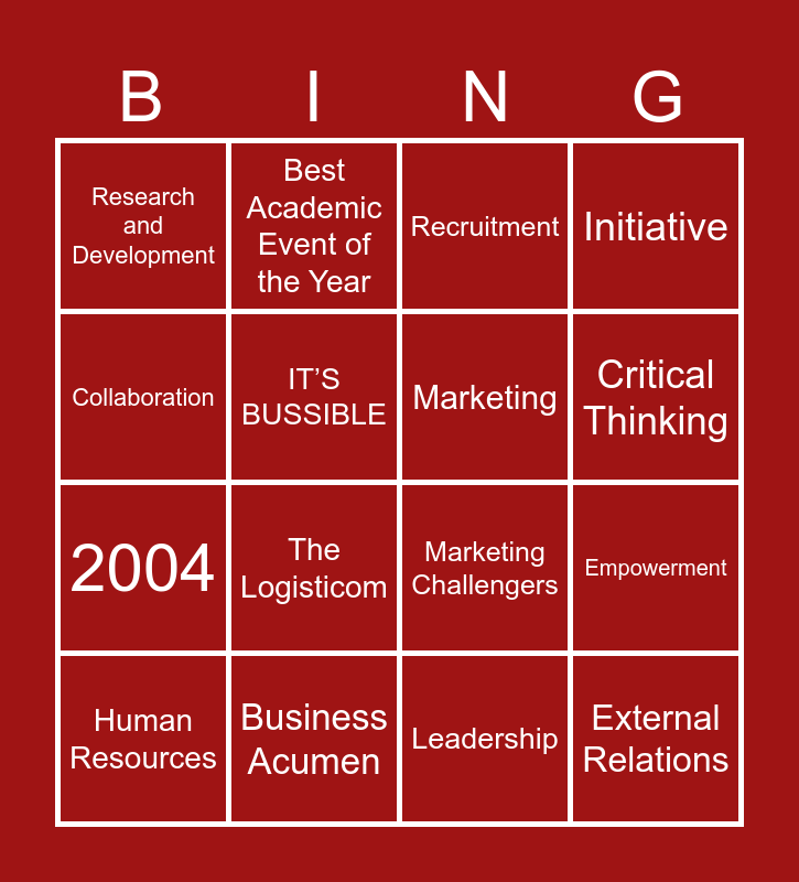 This bingo card has 20 words: Empowerment, Networking, Recruitment, Innovation, Human Resources, Collaboration, Business Acumen, Research and Development, 2004, Best Academic Event of the Year, The Logisticom, Marketing Challengers, IT’S BUSSIBLE, External Relations, Marketing, Effective Communication, Critical Thinking, Initiative, Leadership and Growth Mindset.