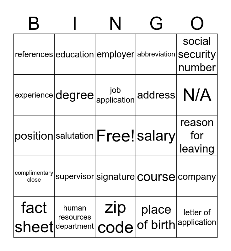 This bingo card has a free space and 24 words: supervisor, human resources department, job application, fact sheet, social security number, references, experience, education, salary, signature, address, position, course, company, degree, place of birth, reason for leaving, employer, N/A, salutation, letter of application, complimentary close, abbreviation and zip code.
