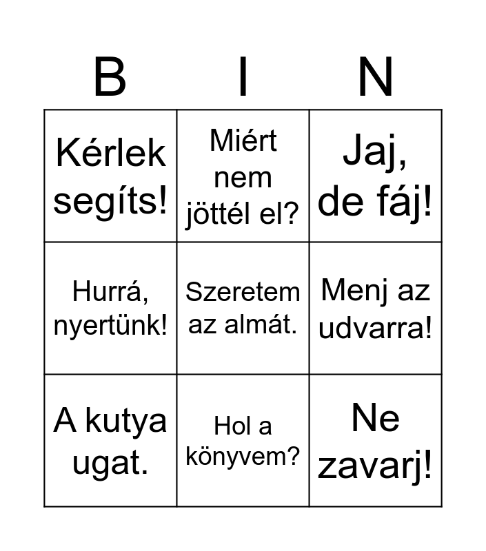 This bingo card has 12 words: De jó lenne úszni!, Ne zavarj!, Szeretem az almát., Menj az udvarra!, Miért nem jöttél el?, Jaj, de fáj!, Hol a könyvem?, Ma süt a nap., Kérlek segíts!, Hurrá, nyertünk!, A kutya ugat. and Mit eszik a nyúl?.