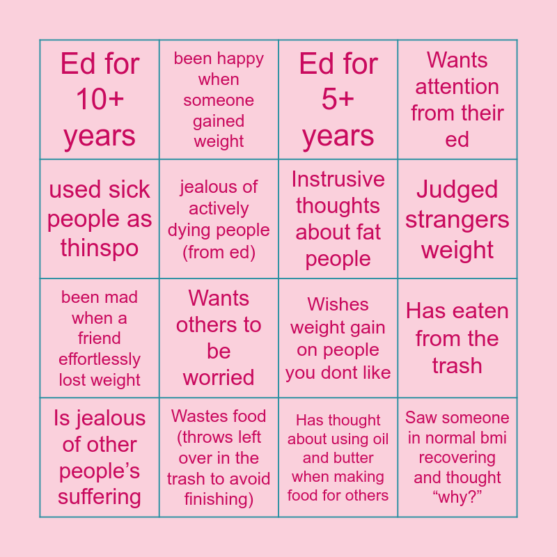 This bingo card has 16 words: Wastes food (throws left over in the trash to avoid finishing), Has eaten from the trash, Ed for 5+ years, Ed for 10+ years, been mad when a friend effortlessly lost weight, been happy when someone gained weight, Wishes weight gain on people you dont like, Has thought about using oil and butter when making food for others, used sick people as thinspo, jealous of actively dying people (from ed), Is jealous of other people’s suffering, Wants attention from their ed, Wants others to be worried, Judged strangers weight, Instrusive thoughts about fat people and Saw someone in normal bmi recovering and thought “why?”.